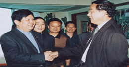 時任河南省人民政府省長郭庚茂先生(左)與臺州商會支部書記、《百花散》傳人梅安富先生合影